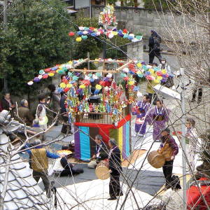 冬から春にかけて太陽の力の復活の時、五穀豊穣を祈るのである。祭壇の中央に太陽をかたどった「梵ぼんてん天」を立て、その前に大日如来を祀る。「講」の人々が祭壇の前で念仏を唱え、梵天の周りを鉦かねと太鼓に合わせ「テントウダー、ナンマイダ」と唱えながら回る。お天道様の祭りだから毎年好天。春、命の再生と豊作を祈る、素朴な爽やかなお祈りである。永く続けて戴きたい。(写真(下右))