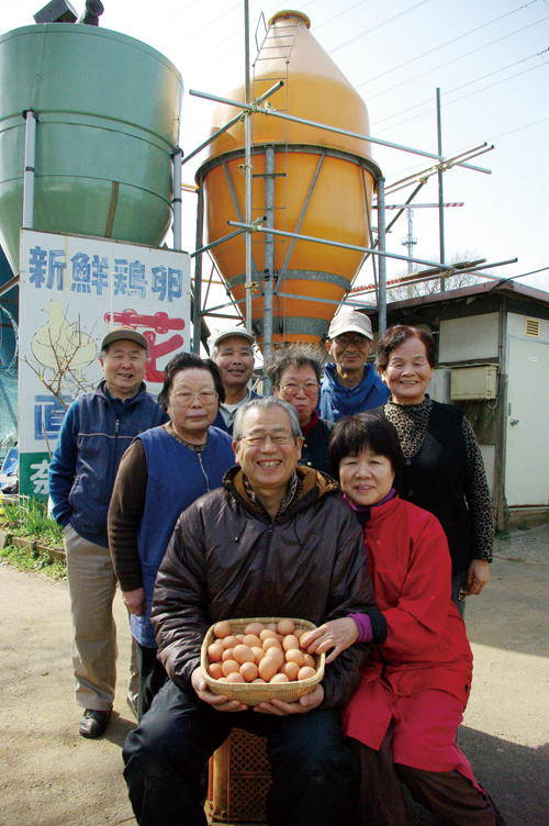 ここでは常時約7千羽が飼育されているが、その大半は『イサブラウン』という品種。それ以外に青いたまごを産む『アロウカナ』という品種の鶏が若干いる。アロウカナは、南米チリのアロウカナ地方で現地の人々が大切に飼育していた地鶏で中世から純血のまま現在に至っているという珍しい品種。「アロウカナの卵は高血圧を抑えたり、脳を活性化させたりする効果が高いと言われています」と奈良さん。奈良養鶏園は奈良さん一家と、数名のお手伝いさん(60~70代)により営まれている。毎日7千羽の鶏が産み落とした卵を一個一個拾うのは重労働で、手間がかかる事だが人の手による作業にこだわる。