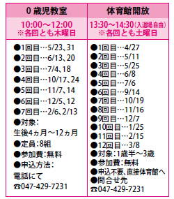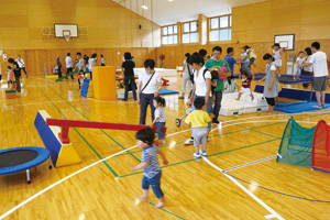 「0歳児教室」は、わらべ歌や赤ちゃん体操など乳幼児とのコミュニケーションのとり方や子育てに関する講話、離乳食の試食といったプログラム。初めての子育てに悩むママを対象としている。「鉄棒」「とび箱」「ボール」「フープ」などで体全体を使うアスレチックを設置。自宅では体験できない ダイナミックな遊びを体験させ、バランス感覚や敏捷性等の運動能力を自然に引き出すと共に、子ども同士のふれあいや競い合いを通じて自発性やコミュニケーション能力の向上などを刺激する目的。