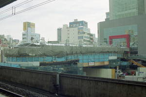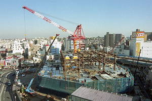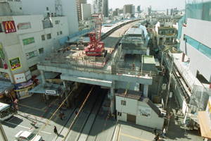 ![]() ▲【2002年12月】 駅と再開発ビルを結ぶ連絡通路が架けられた。 他の場所で組んだものを一度解体して夜中に組み なおした |