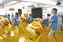 ![]() 地域の子ども達が集まって楽しそうに太鼓をたたく「かいなん太鼓」 |