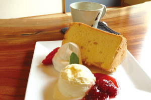 ![]() モチモチでふわふわのシフォンケーキ (ドリンクセット750 円)はオリジナル |