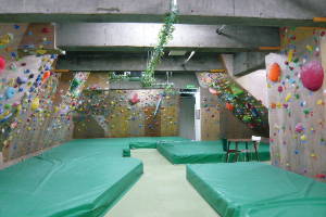 壁に取り付けた「ホールド」とよばれる石をつかんで登るクライミング、ボルダリングのできることで話題。小さいお子さんから年配の方まで挑戦中! |