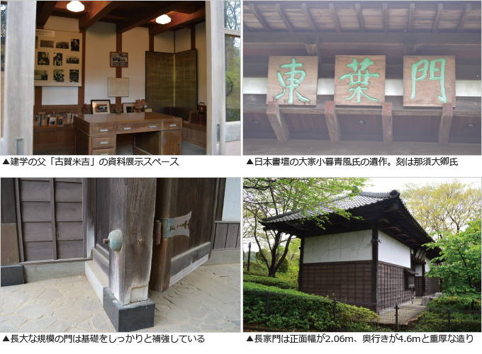 ◆鮮やかな木々の緑の中に重厚な門構えが映える 平成12年11月に、国指定登録有形文化財となった東葉門。江戸幕末期に上飯山満村の名主惣代を務めていた近藤四郎左衛門の屋敷の長家門として使われていたもので、現在は東葉高等学校の正門として使われている。船橋市宮本に校舎があった東葉高等学校が、以前からグランドとして使っていた屋敷跡に校舎を移転した際、長家門の土台などを補正、化粧直しなども施して正門として使用している。 上飯山満村は小金五牧と称する幕府直轄の牧場に接しており、近藤四郎左衛門は牧士にも任じられていた。牧士は帯刀、乗馬、鉄砲所持が許される武士階級の身分が約束され、村人からは殿様と呼ばれるほど財力を保持していた。それゆえ屋敷は広大で、入口だった長家門は正面幅が2.06m、奥行きが4.6mと長大。 門に掲げられている「東葉門」の扁額は、日本書壇の大家小暮青風氏の遺作になったもので、刻は那須大卿氏である。