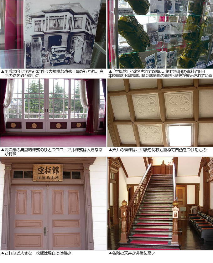 ◆鮮やかな木々の緑の中に重厚な門構えが映える 空挺館の歴史は古く、東京都目黒区駒場に陸軍騎兵実施学校が置かれていた頃、卒業式や演習等を天覧されていた天皇のため、明治44年に「御馬見所」が建設された。 大正5年に陸軍騎兵実施学校が習志野原へ移転された際に、御馬見所も移設され、高官や外国貴賓接客用の施設として使用されていたこともあった。当時は輸送手段が馬か鉄道に限られていたため、土台部分や支柱の一部を輸送することができず、御馬見所跡地として現在も残されている。 バルコニーが特徴的なコロニアル様式による建築で、各階の天井が非常に高く、2階建てにも関わらず、外観の高さは15m以上もある。正面の扉はそれぞれ一枚板で作られており、これほど大きな一枚板は現在では希少。天井の模様は、和紙を何枚も重ねて凹凸をつけたものなど、当時では珍しい材料・建築方法などが用いられている。平成23年に建設100周年を迎え、老朽化に伴う大規模な改修工事が行われ、白亜の姿を取り戻し、気品と風格も蘇った。