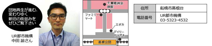 ◆進む団地再生!新旧が同居する街並み 昭和47年に総武快速線が開通、その後京葉線・東葉高速鉄道などが次々と開通したことで、船橋の交通網は充実していった。また、交通網の充実に伴い、市内には夏見台・若松・高根台・行田・芝山の公団団地、民間団地の造成が盛んに行われた。当時は設備なども最先端だったが、市内各団地ともにその老朽化や間取りなど住宅規模においの不具合が生じ、現在では随時建て替えが進められている。 高根台団地は昭和36年に建設。日本都市計画学会石川賞を受賞した建築士、津端修一氏による設計で、地形を活かしたポイントハウスやテラスハウスの絶妙な配置がとられていることでも有名だ。現在は段階的に建て替えが進められ、民間団体を誘致することで、病院や保育園、福祉施設に戸建てエリアもある。ニーズに合わせたひとつの街として機能するエリアになってきている。若い人が入ってくることにより商業施設なども増え、街が活性化して老若男女が集うという好循環により、かつての活気を取り戻しつつある。