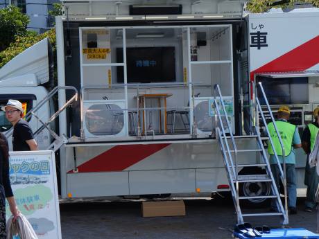 メイン展示された商業用トラックは全日本トラック協会が認定・交付している”安全性優良事業所認定”の証、「Gマーク」が貼られたもの。実際に乗車し、死角や内輪差など体感できる。ほかにもシートベルトとエアバックの大切さを知る衝撃体験車両や、自転車シュミュレータ、視野診断などを搭載した「交通安全適性診断車ちとらくん」などの珍しい車両も登場した。