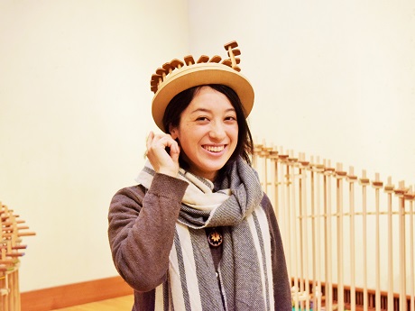 「輪唱の◯」は美しいオブジェを思わせる作品だが、上から木のボールを転がすとらせん階段のように並べられた板が鍵盤ように音をたて、音楽を奏でる。板は音階により色分けをしていて、来場者は鍵盤を入れ替えて曲を作って楽しむこともできる。「子どもたちには説明が要らず、すぐに自分の好きな曲に並べてしまいます」とつちやさん。