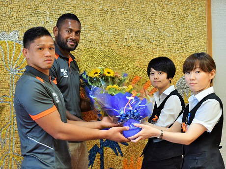 この日はまず11時に7人制ラグビー代表のトゥキリ選手と合谷選手が市長を訪れた。両選手は今年3月にクボタスピアーズに入団後、6月に日本代表に選ばれた。両選手ともリオ五輪では全試合に出場。