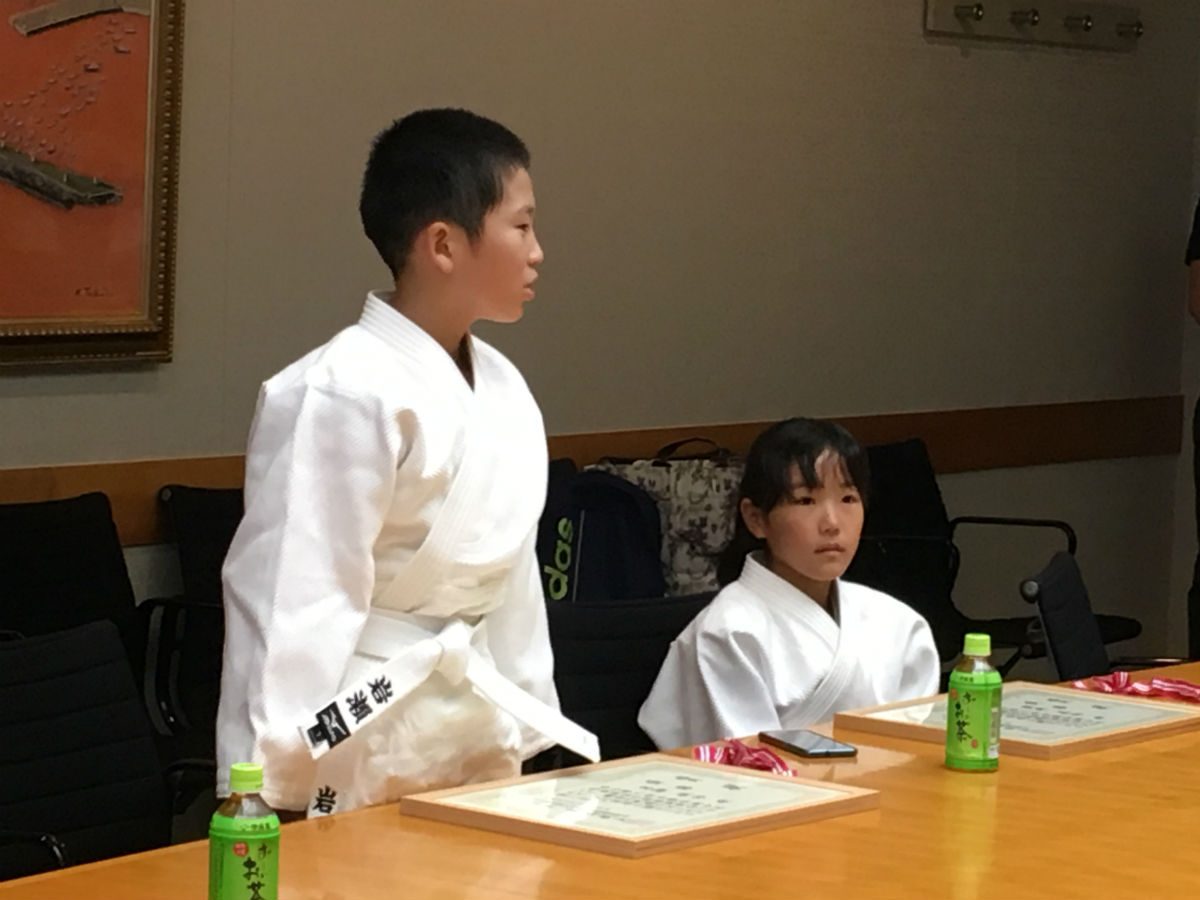 中山柔道会所属の岩瀬駿佑選手と荻野美紅(みく)選手が8月27日、船橋市役所(船橋市湊町2-10-25)を訪問し、「平成30年度千葉県少年柔道大会 形競技会」で初優勝、「第8回日整全国少年柔道形競技会」に出場することを市長に報告した。