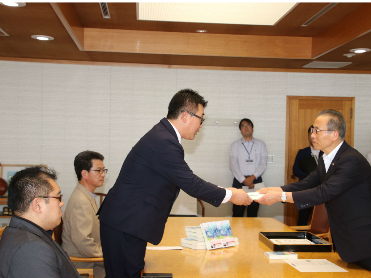船橋宿場町再生協議会の理事長大木武士さん、監事蓮池政貴さん、高村清太郎さんが10月1日、「眼鏡の日」に合わせて小説「きらきら眼鏡」を150冊寄贈するために船橋市役所(船橋市湊町2-10-25)を訪問した。