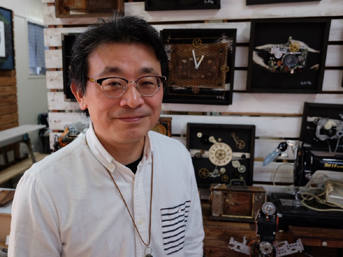 小山さんの作品は、電化製品の部品や古材などを使用した「再生アート」や、絵画、アクセサリーなど。「昔、故障した電化製品を何気なく分解したときに、一つ一つの部品がとても格好よくて。これを使って何か作品を作りたいと思ったのが始まりです」と「再生アート」をつくるようになったきかっけを話す。