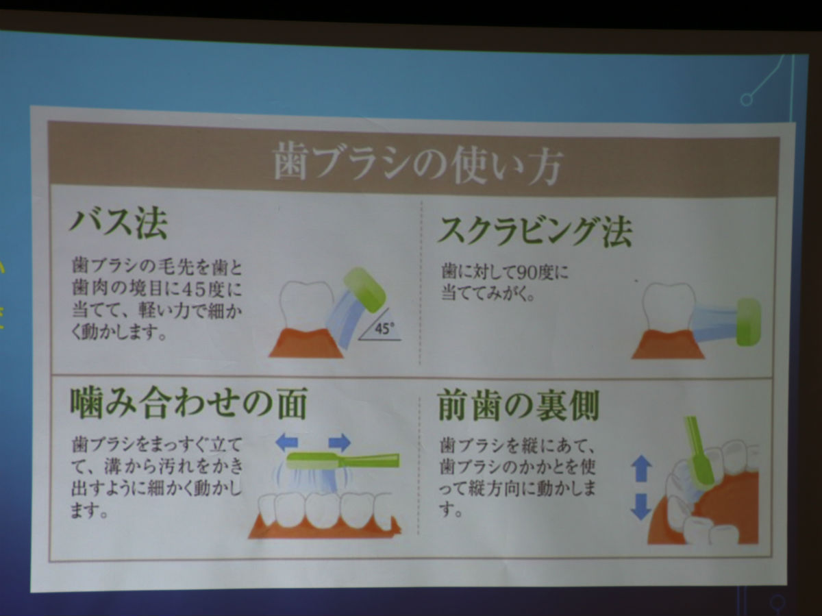 講師を務めるのは山崎歯科医院の院長山崎繁夫さん。人体に棲みつく細菌が約700種あるという話から導入し、体内で細菌密度が一番高いのが「歯垢」だと説明。その数は糞尿中のそれよりも多いという。
