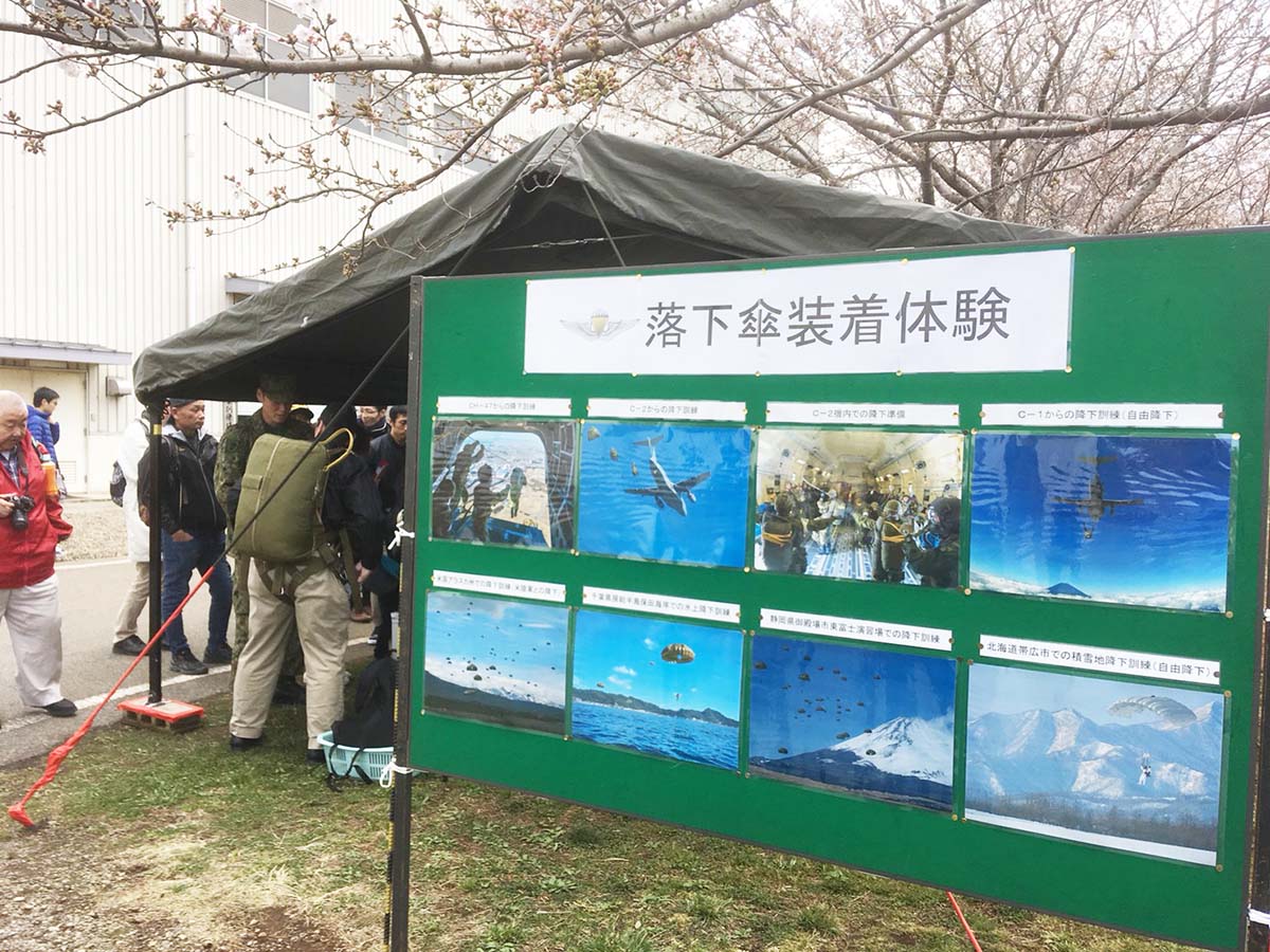 イベントの内容は、記念式典、現役隊員によるパレード、落下傘装着体験など。落下傘降下も予定されていたが、強風のため中止となった。場内には綿飴や射撃、焼鳥、ラーメンなどさまざまな屋台が並び、子どもに加えて大人も列を作っていた。場内では芝生の上にレジャーシートを広げて花見を楽しむ姿も多くみられた。