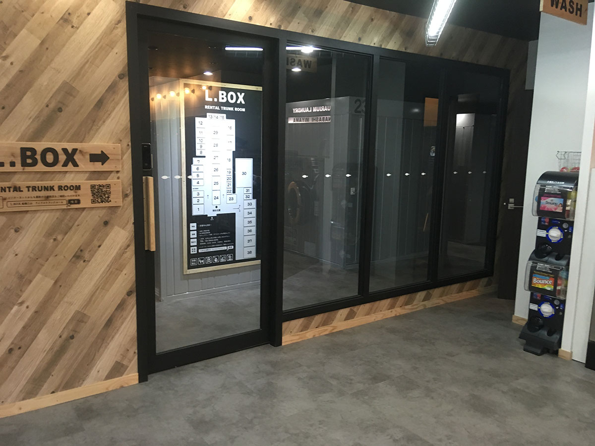 店内にはレンタルの収納スペースもあり、コインランドリー利用者の「洗ったものをそのまましまっておける場所がほしい」との声をヒントに始めたという。収納スペースとランドリースペースはガラス戸で区切られており、ICで解錠、オートロック、各室ダイヤル錠などセキュリティーにも配慮している。