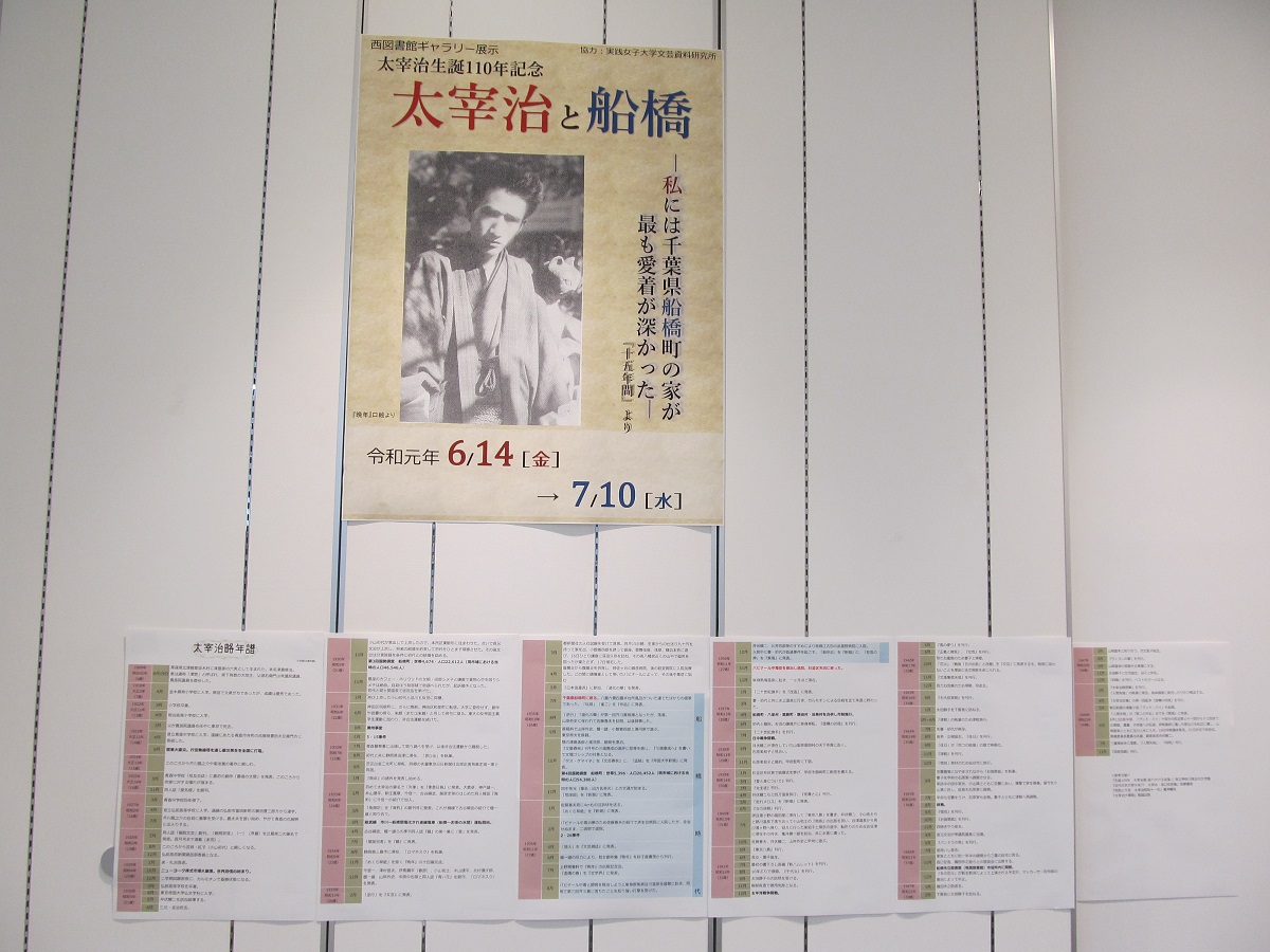 西図書館(船橋市西船1-20-50)の2階ギャラリーで、6月14日から太宰治生誕110年を記念し、「太宰治と船橋」が開催されている。