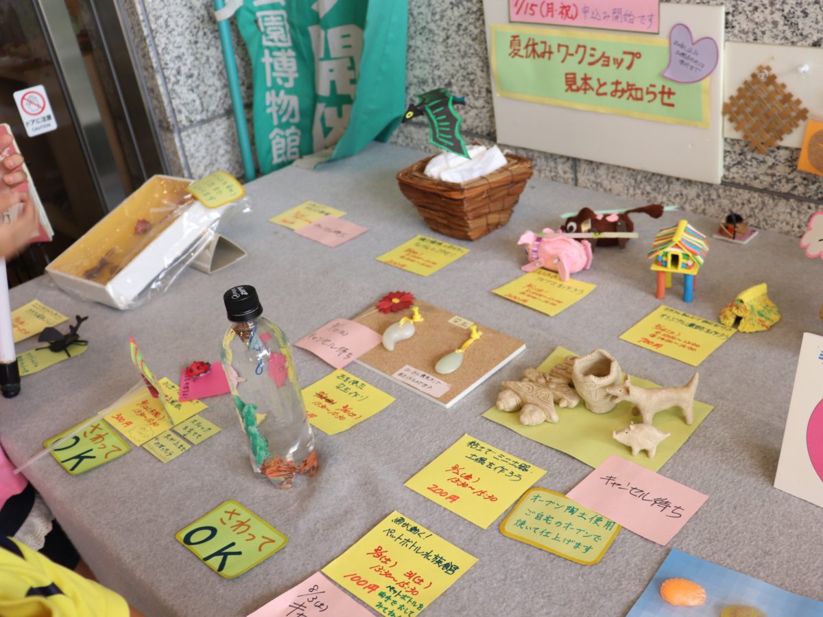 「期間中である夏休みには、連日さまざまなワークショップを用意しています。無料のものもたくさんあるので、お子さんはもちろん、どなたでも楽しんでいただきたい」と同館館長代理の河西敦史さん。無料ワークショップは「縄文ちぎり絵」「モビール作り」など。有料ワークショップには「縄文模様の羽ばたくちょうちょとコウモリ」(200円)、「土器復元ワークショップ」(500円)、「ミニ土器・土偶を作ろう(200円)」、「竹で楽器を作ろう」(500円)などがある。