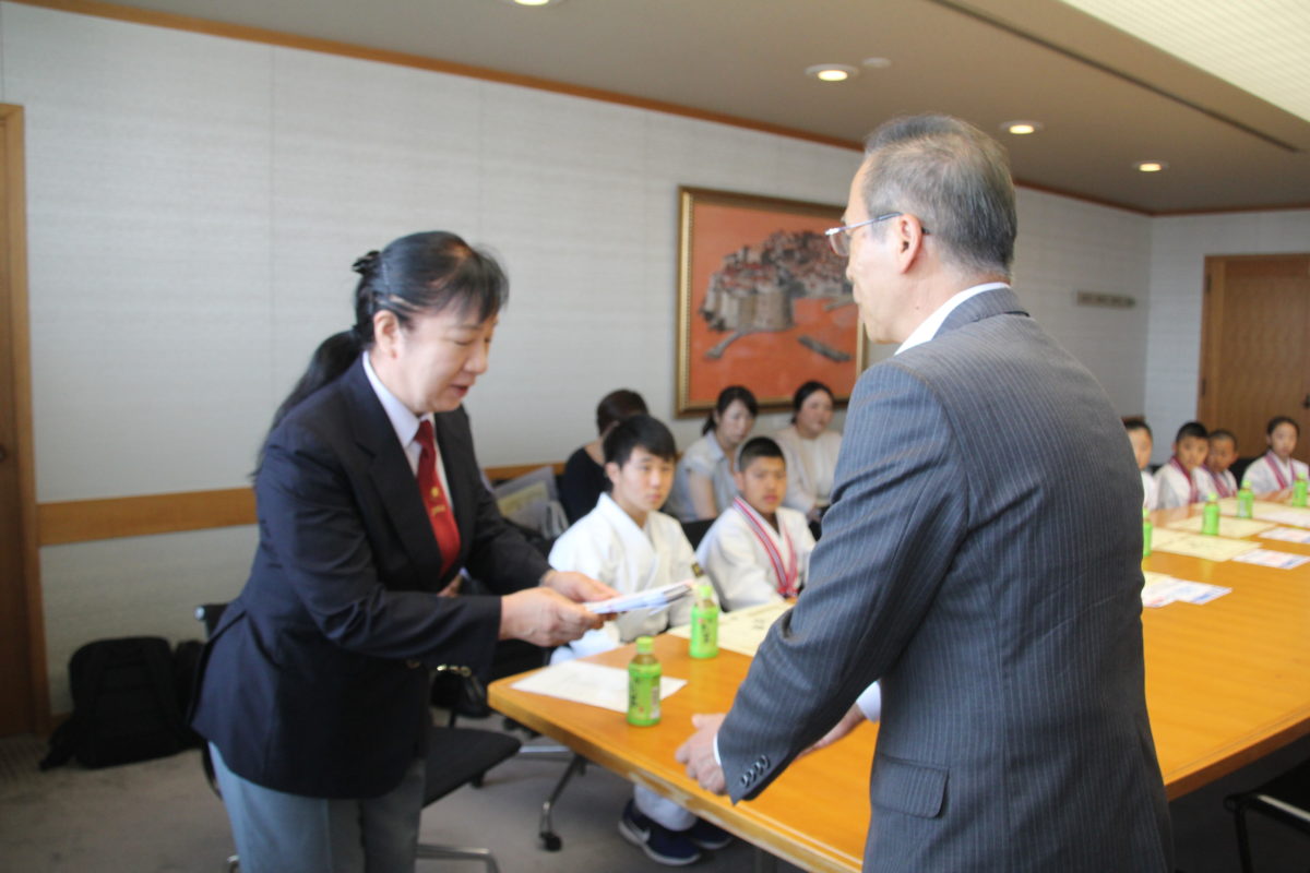 今回表敬訪問に訪れたのは、8月3日~4日に三重県営サンアリーナ(三重県伊勢市)で行われる「第62回小学生・中学生全国空手道選手権大会」に出場の決まった西塚愛純さん(習志野台第二小3年)、秋山照太くん(田喜野井小4年)、森山慧音くん(高郷小4年)、望月日向さん(飯山満小4年)、秋山桜月さん(三田中1年)、西塚悠真くん(習志野台中1年)、森山結斗くん(七林中1年)、後藤響輝くん(三田中3年)の8人と同会代表の若梅陽子さん。