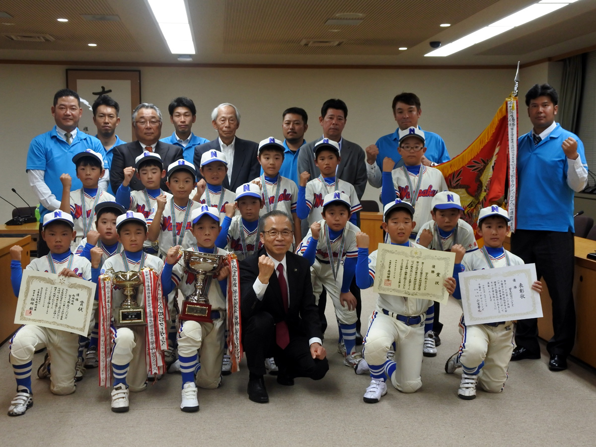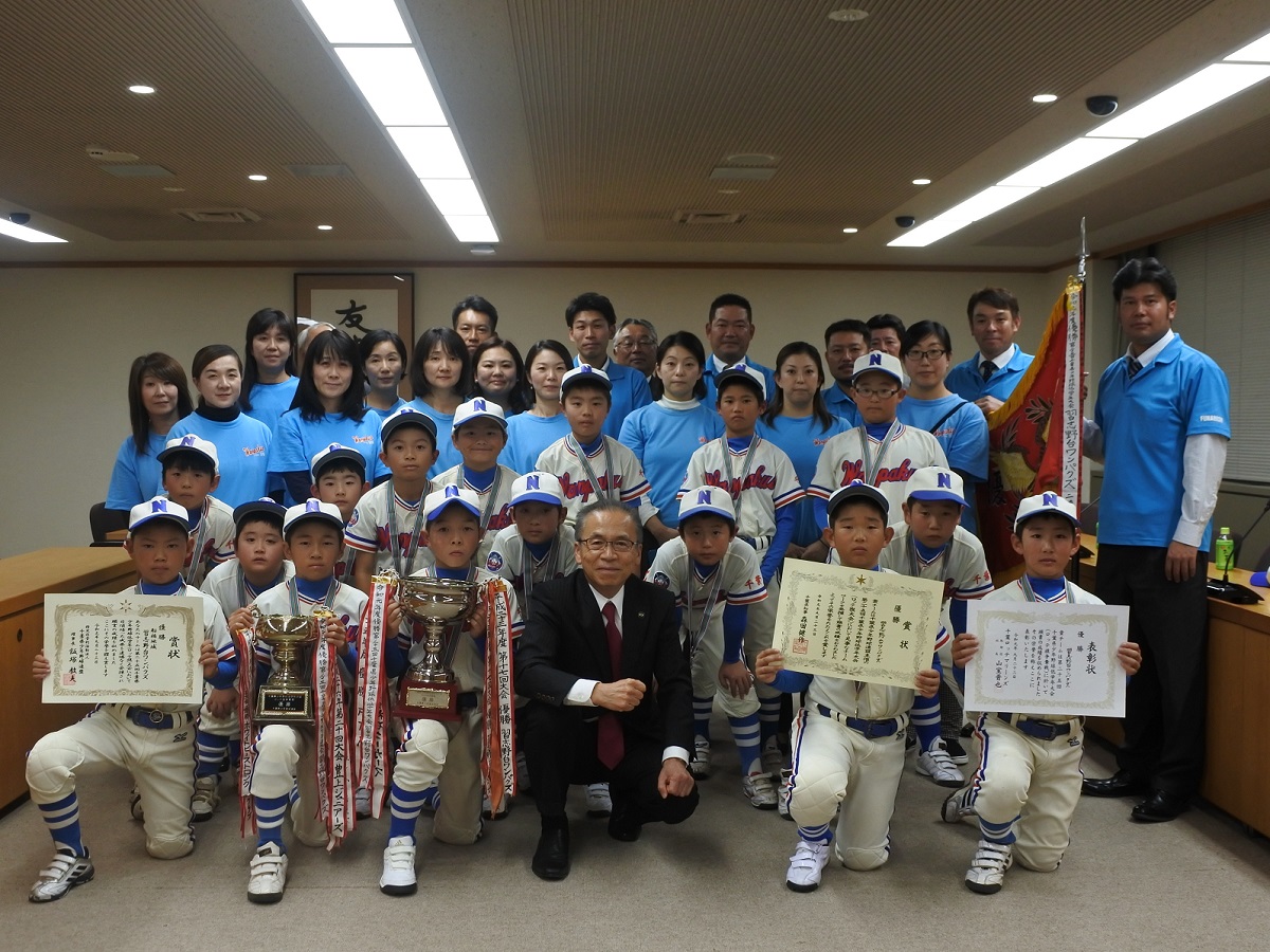 少年野球チーム「習志野台ワンパクズ」の選手が11月6日、千葉県少年野球低学年大会で優勝したことを松戸徹市長に報告するため、コーチや保護者らと船橋市役所(船橋市湊町2-10-25)を訪れた。