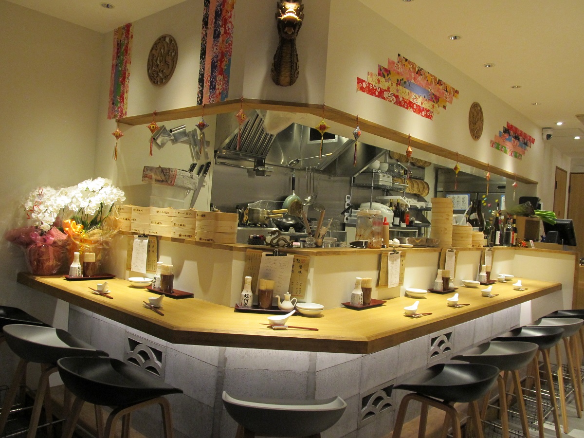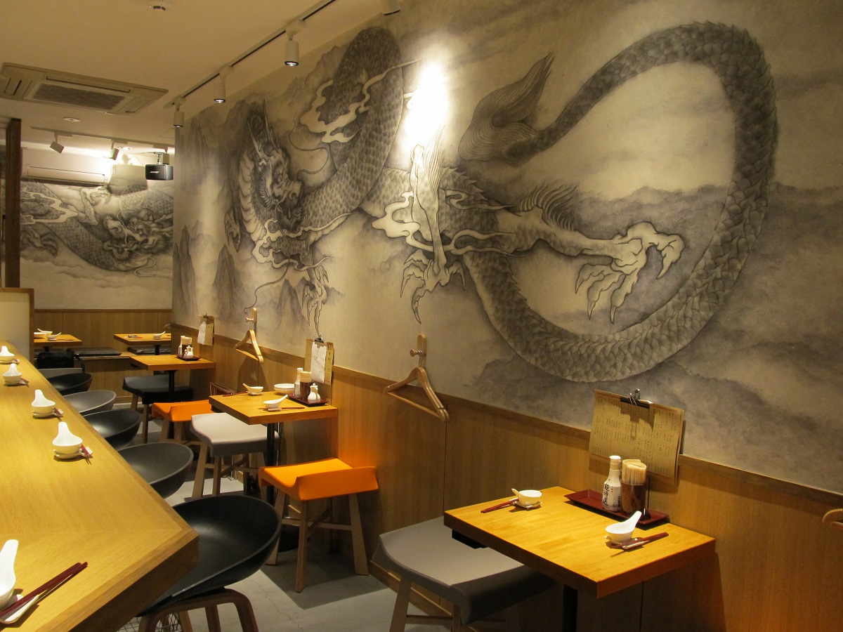 店内の白い壁一面には、台湾で縁起物とされる大きな龍が墨1色で描かれ、木の温もりを感じるカウンター席とテーブル席とあわせて21席を用意。