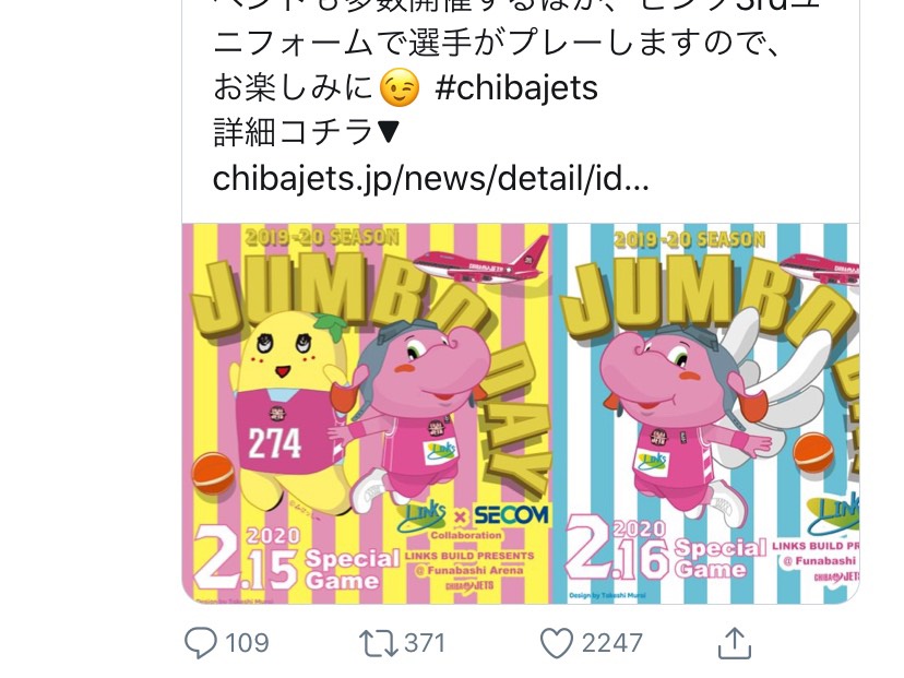 千葉ジェッツふなばしの公式ツイッターアカウントも「千葉ジェッツふなっしー」にいつの間にか変更、2月15日・16日の2日間向けとみられるジャンボくんとふなっしーコラボのオリジナル画像も公開されており、既に関係者やファンの間で多くのリツイートがされている。