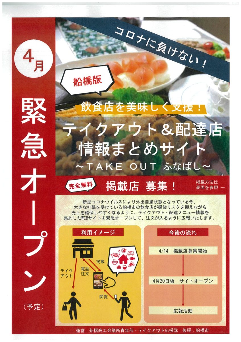 新型コロナウイルス感染症による自粛営業などで大きな影響を受けている地域経済支援を目的に地域の経営者団体「船橋商工会議所青年部(通称:船橋YEG)」メンバーが、テイクアウト提供の飲食店を集めたサイト「TAKE OUTふなばし」を開設、4月20日リリース開始に向けて飲食店の掲載募集を開始した。
