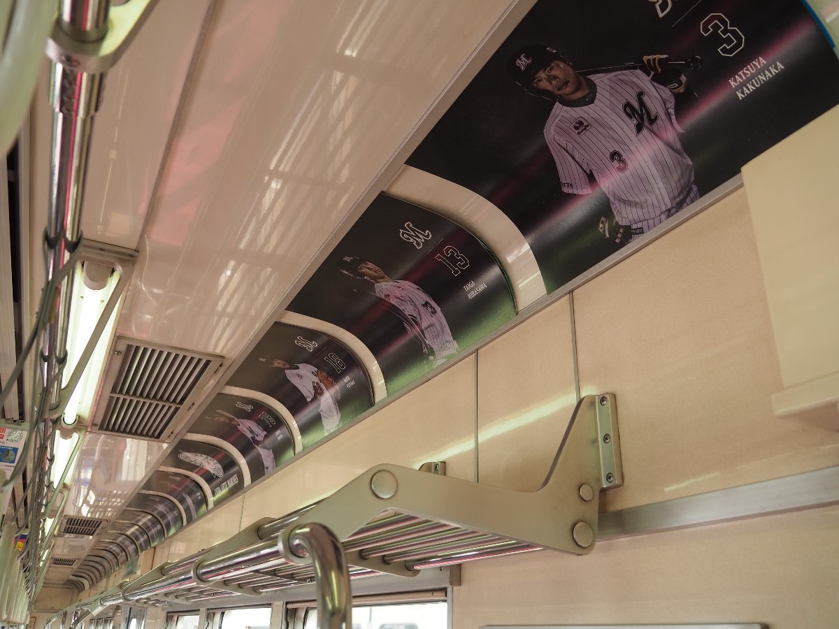 車内の中づりや窓上も千葉ロッテマリーンズのポスターで埋め尽くし、電車の両先頭にはヘッドマークも貼り付けている。