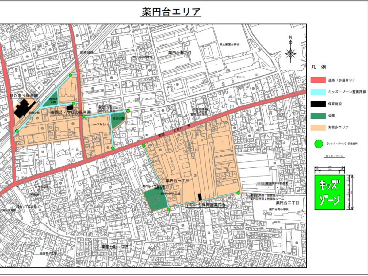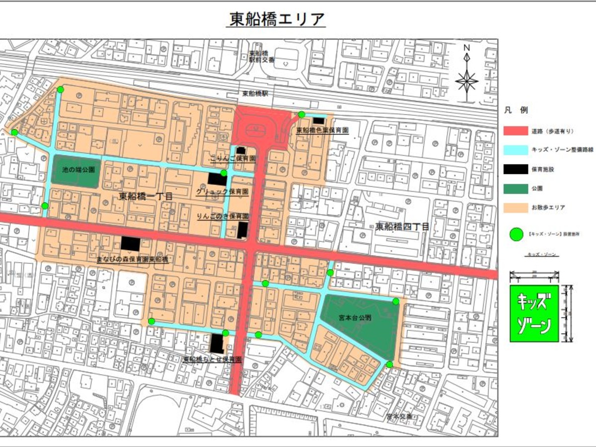 船橋市は保育所等が多く集まる地区で園児の散歩など園外活動の安全を確保し、交通安全対策を強化するため現在、市内3地区29カ所に「キッズ・ゾーン」を整備している。これは千葉県内では初のキッズゾーンとなる。