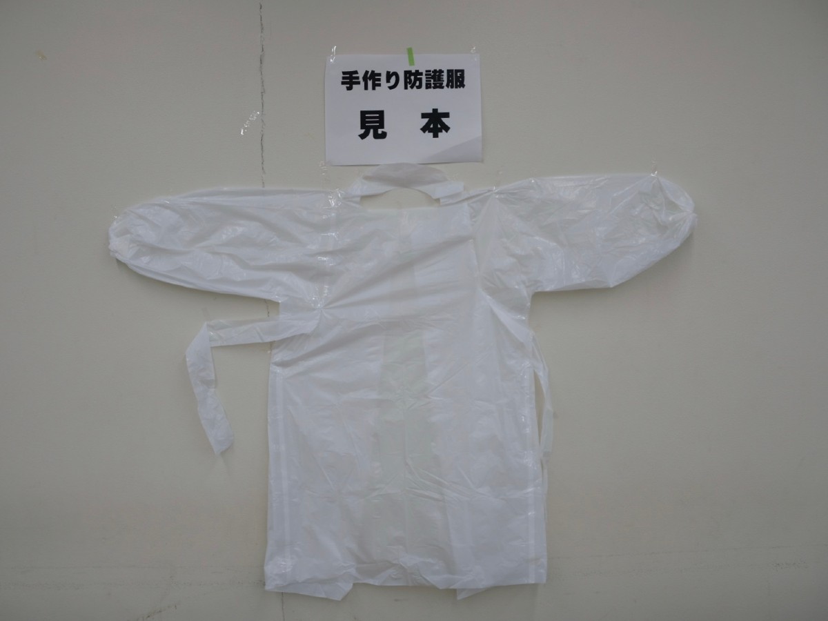 講座内では、ガウンテクニックの実演が行われた。その後、参加者は4グループに分かれ、訪問介護先での着脱を想定した練習が行われた。