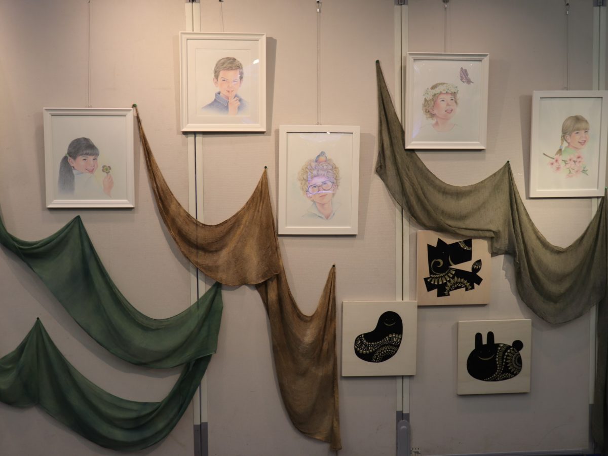 色鉛筆でイラストレーションを描くアーティスト・釘本緑(くぎもとみどり)さんはの作品は、森の中に子どもたちの笑顔がチラチラと見えているかのように展示されていた。