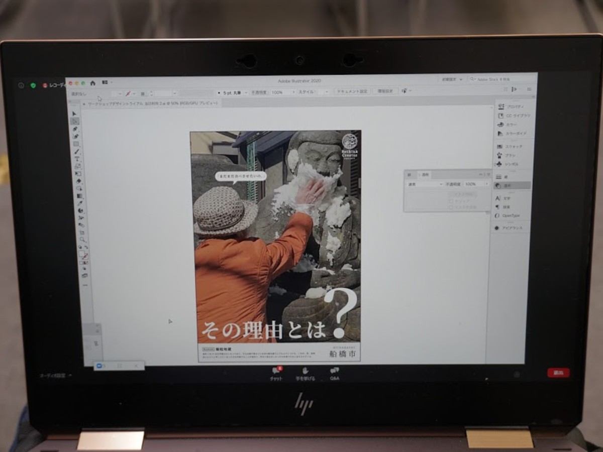 ワークショップは「写真のコピーを考えて地元の魅力を伝えてみよう」と2枚のポスターを作る内容となり、リアル参加者は紙に書いてアイデアを提出し、オンライン参加者はZOOMのチャット機能で投稿する形でアイデアを出し合った。