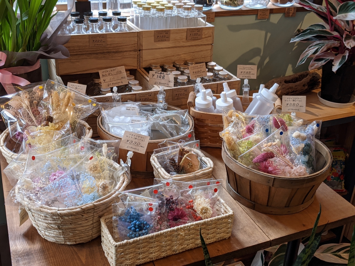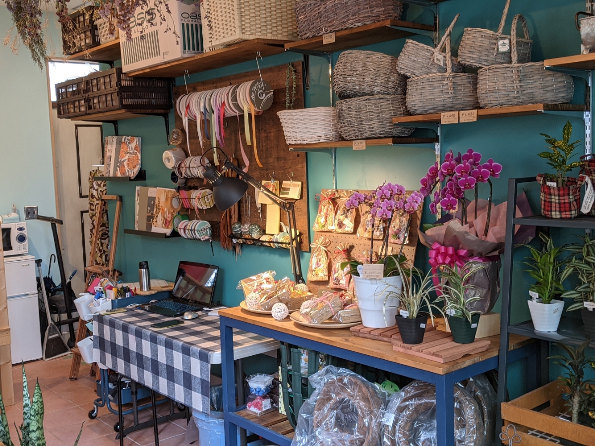 店内は古板さんみずからDIYをし、ウッド調の優しい雰囲気。花や観葉植物をはじめ、ドライフラワーを使った手作り雑貨や、薬園台にあるカフェ「koya」のお菓子を扱う。また子連れでも来店しやすいようにキッズスペースも用意。ワークスコーナーもあり、購入した花をその場で植えることもできる。