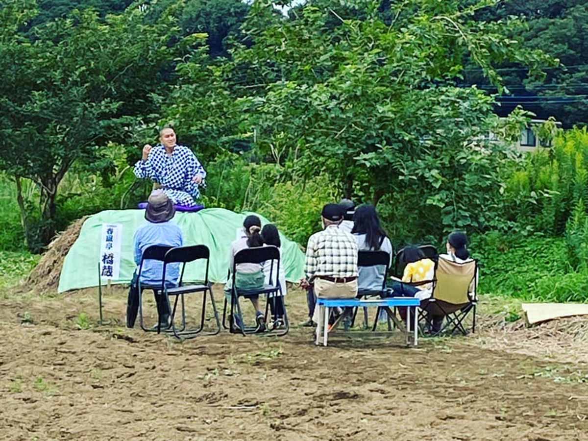 畑の草で組んだ高座では、落語芸術協会所属・二つ目の春風亭橋蔵さんと瀧川鯉舟さんが落語を披露。来場した30代主婦は「一風変わった演出で面白かった。まさかこんな場所で落語が聞けるとは思わなかった」と話す。