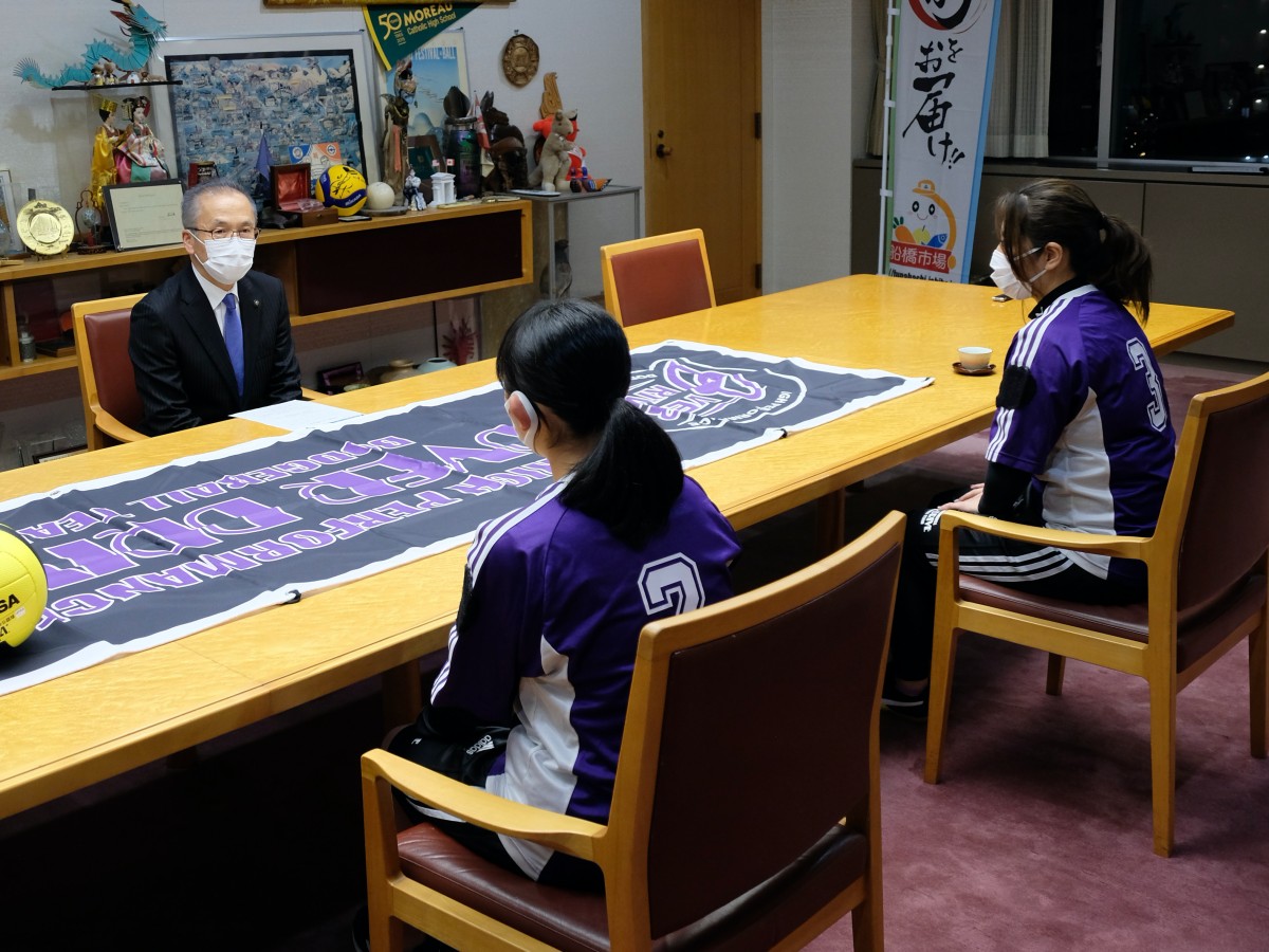今回、松戸徹市長を訪れたのは、同チームに所属で、12月13日に「アダストリアみとアリーナ」(茨城県水戸市)で行われる全国大会への出場が決定している船橋市に在住のメンバーの、会社員の鈴木珠江さんと千葉県立船橋法典高校1年の大谷結花さん。同じく出場予定の医療従事者の海野紫織さんは、同会への参加は見送った。