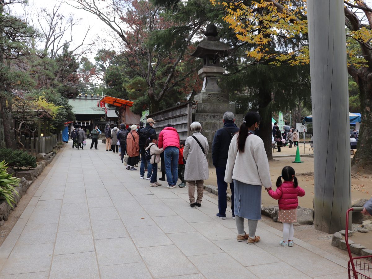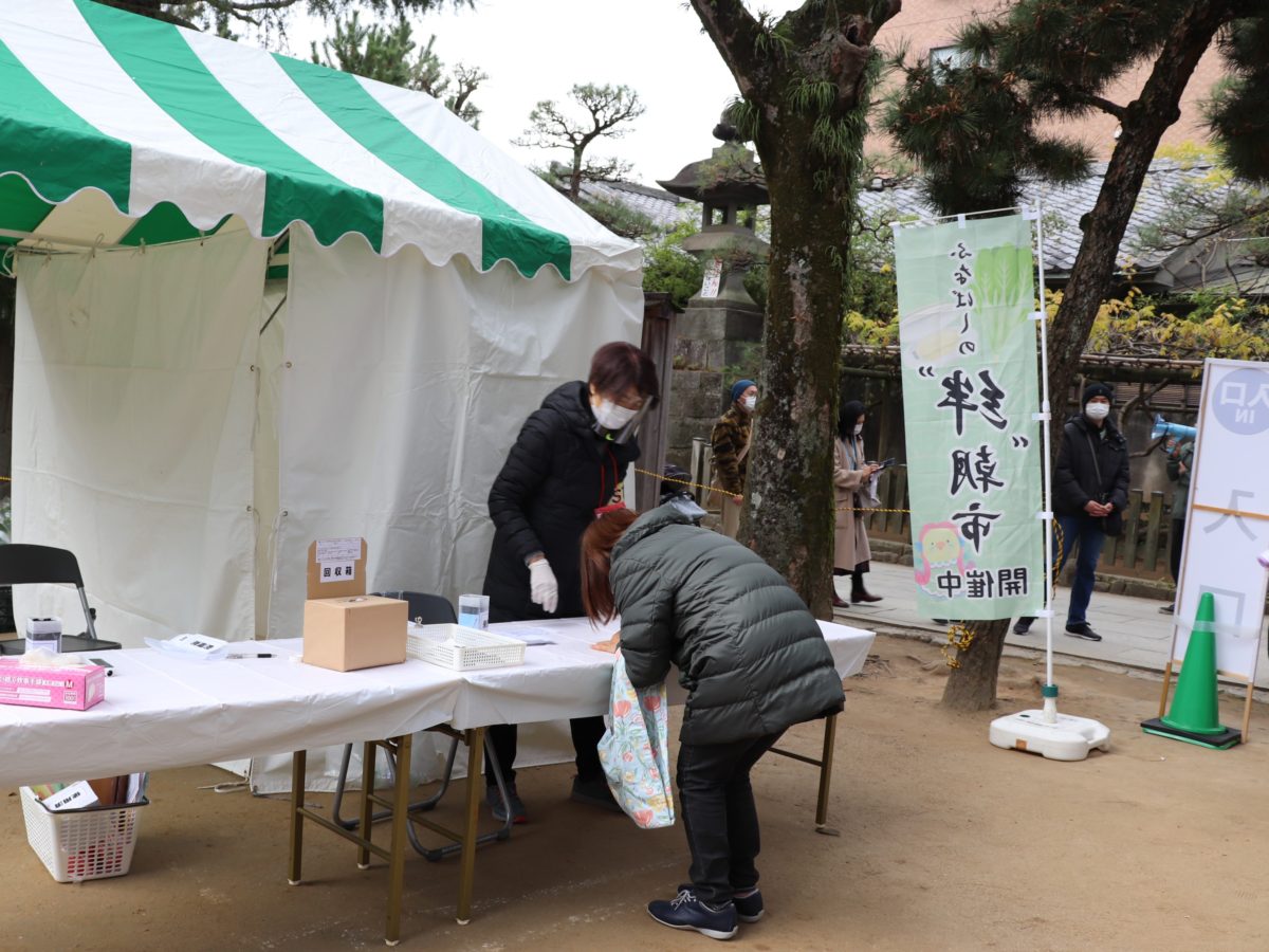 これまで船橋大神宮(船橋市宮本5-2-1)で開催されてきた「ふなばし朝市」は今年度、主催者と名称を「ふなばし“絆”朝市」と変え、前回の「ふなばし朝市」からは約10カ月ぶりとなる12月12日、同所では今年度初となる朝市が開催され、約400人が会場に足を運んだ。