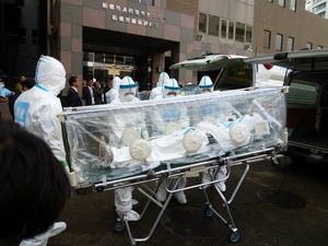 千葉県では、感染した疑いのある患者が発生した場合、成田赤十字病院(成田市)に移送すると決められている。この日の訓練でも、船橋警察署パトカー先導のもと、消防署の救急車と保健所車輛が搬送を行った。