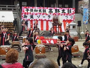 御滝不動尊(船橋市金杉6-25-1)の境内で4月3日、第12回高野太鼓&御滝ソーランまつりが開催され、多くの観客が和太鼓の音色とよさこいソーランを楽しんだ。