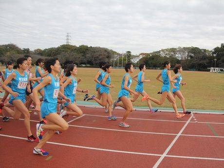 最初のスタートは、中学生女子1年生3キロのコース。9時丁度、松本文化教育長のピストル合図で全員が一斉にスタートを切った。陸上競技場トラック1周を走り抜けると、多目的グラウンド、テニスコート、市民野球場を回って戻ってくるコース。