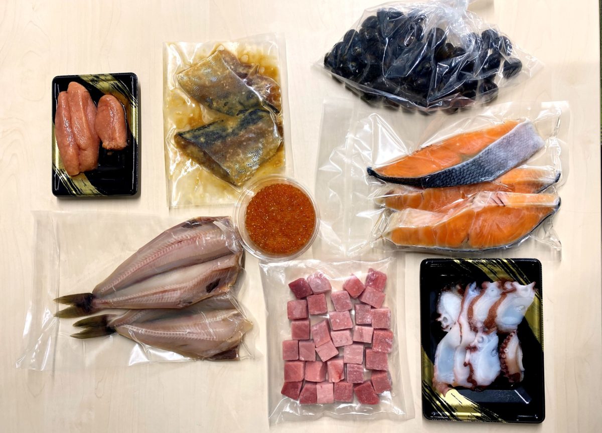 今回の企画は第6弾。内容は、縞ほっけ、マグロサイコロカット、鮭の切身(甘塩)、明太子(無着色)、いくら醤油漬け、西京漬け、北海道産ボイル水たこ、しじみという8種。