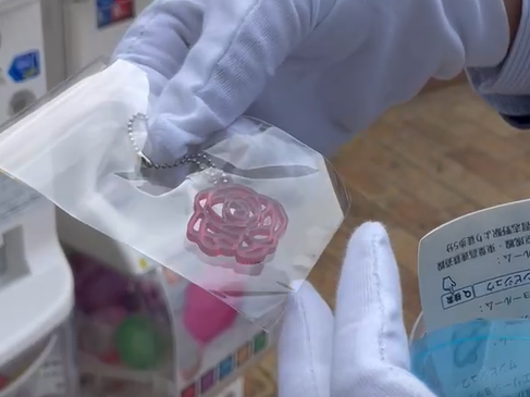 「ある日、弊社にある3Dプリンタで作ったものを園の担当に見せたところ、ジュエリーだけでなく、親しみやすいものも欲しいねという話に。アクリル素材で作ったものを、さらにジュエリーを研磨する機械でていねいに研磨し、色付けは社内で鍋で煮るような形で染色して商品になっています。そうしてできあがったものを、バラ園さんが持つガチャガチャの機械に入れていただけることとなりました」と岡田さんは経緯を話す。