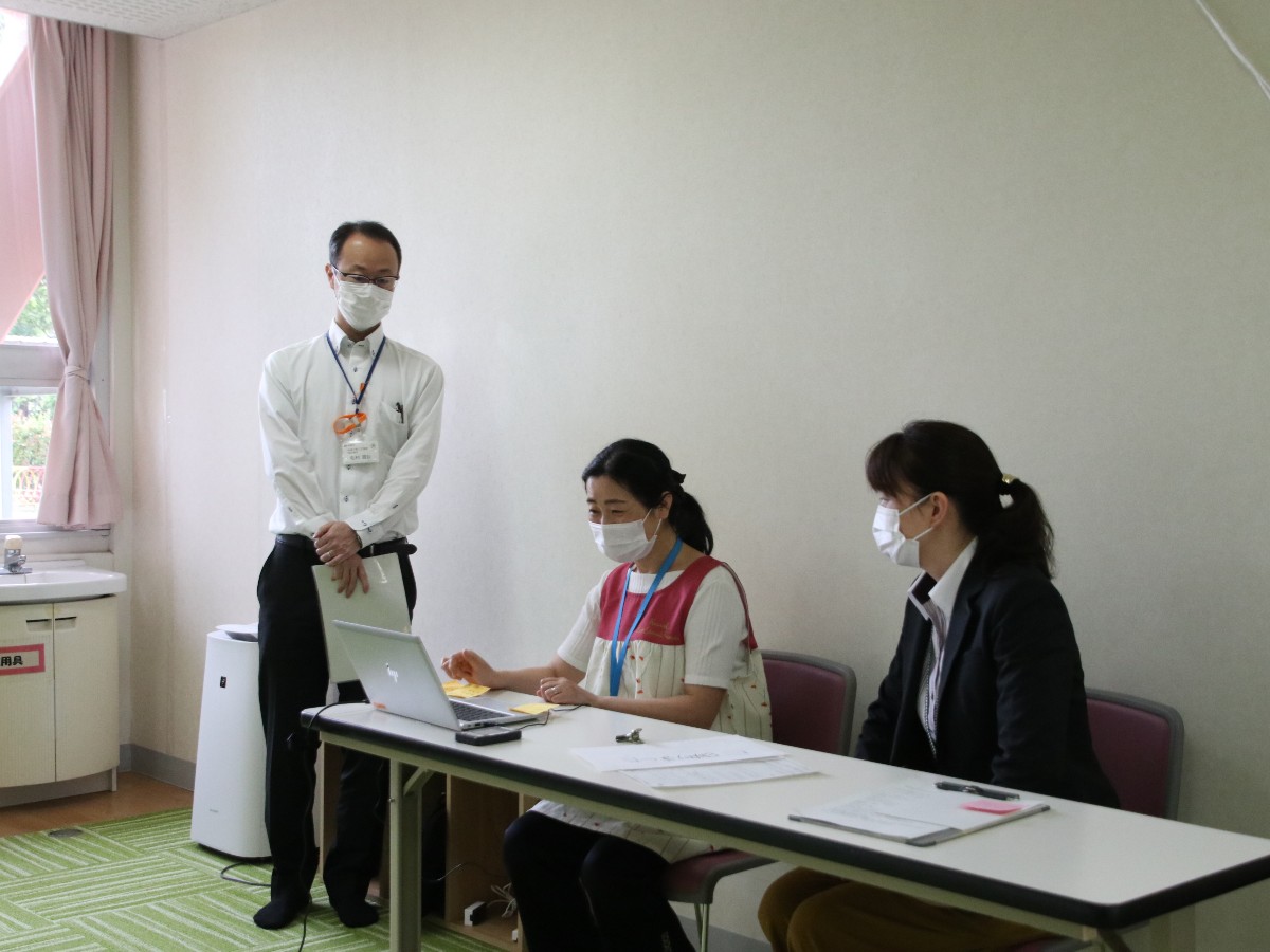 同交流会のスタート時、モニターに参加者の表示ができないトラブルがあったが、場所を変えるなどして迅速に対応したスタッフ。同地域子育て支援課主任の高橋若葉さんは「南本町と高根台のスタッフと市の職員で、事前に何度もZOOMの使用について試行しました」と交流会実施に向けて準備をしてきたことを話した。