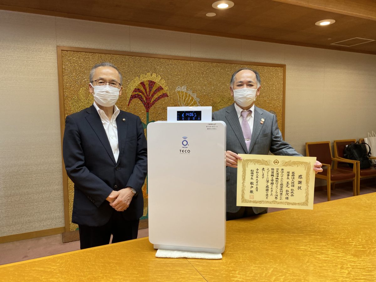 船橋市内に本拠地を置く医療法人社団弘成会は8月16日、船橋市に空気清浄機能付きオゾンエア消臭・除菌機10台を寄贈・追加で10台を無償貸与したことで9月15日、松戸徹船橋市長から感謝状の贈呈を受けた。