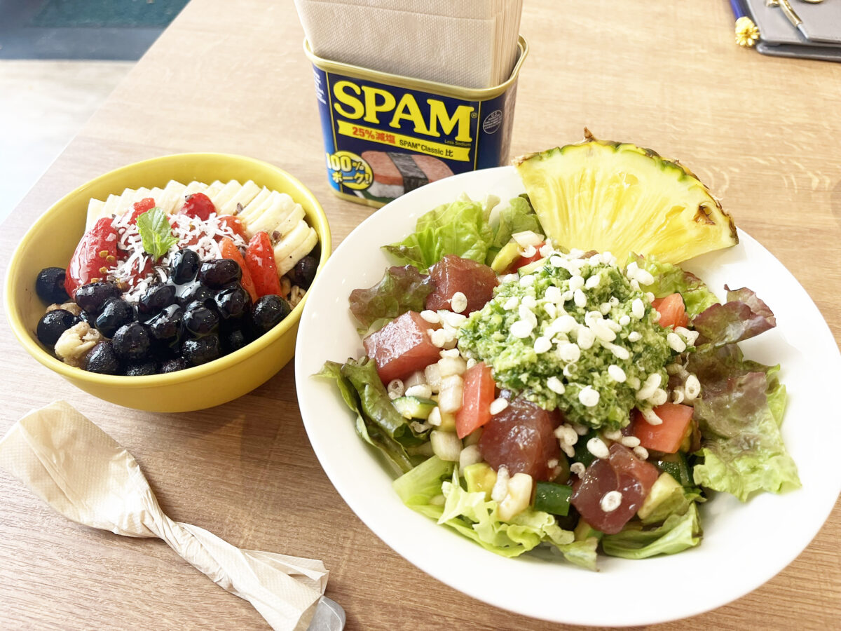 (右から)野菜がたっぷり入った「ジンジャーアヒポケ丼」とアサイーボウル