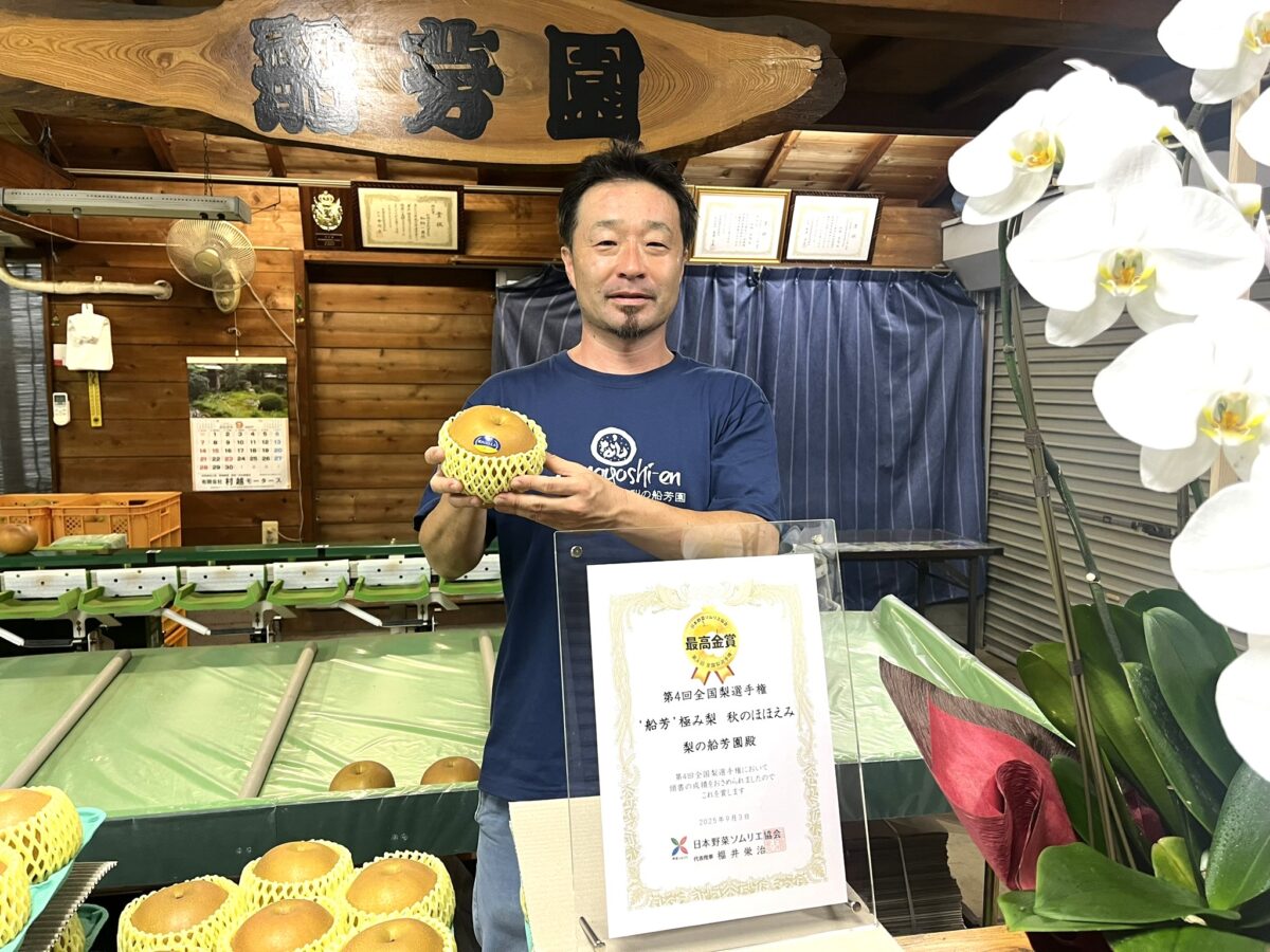 二和エリアの梨農家「船芳園」園主・加納芳光さんは「今年初めてこの選手権にエントリーした。まさか最高金賞を穫れるとは思っていなくて驚いた」と感想を話した。