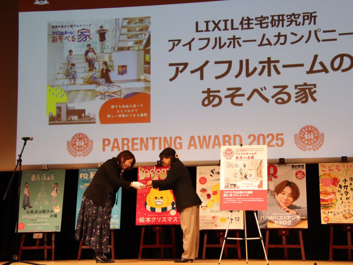船橋市運動公園前にあるモデルハウス型の子育て支援拠点「アイフルホームのあそべる家」(船橋市夏見台5-8-19。運営:LIXIL住宅研究所)が、子育て支援に貢献したサービスや人物を表彰する「第18回ペアレンティングアワード」のモノ・サービス部門を受賞し、授賞式が11月26日、東京都内で行われた。