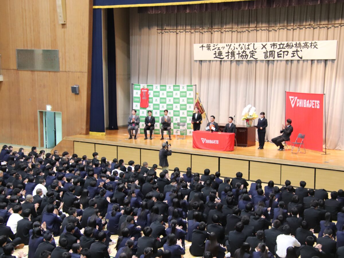 調印式には全校生徒・教員が集まり、千葉ジェッツからは田村征也社長と取締役・佐藤博紀さんが参加した。「公立高校とプロスポーツ球団が連携協定を結ぶのは、おそらく日本で初めてではないか」と同校の近藤義行校長。