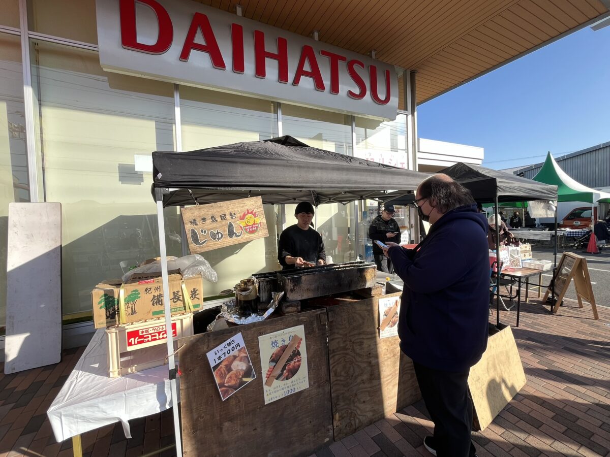 同日は店舗前にキッチンカーが並び、屋外のテントでは千葉県内各所から出店者が集まった。「高滝湖どうしたきくらげ」(市原市)やシーグラスアクセサリーを販売する「Pino」(富津市)などのほか、「生活クラブ生協」、広島お好み焼や焼き鳥屋台も出店。一部の店舗はダイハツの移動販売レンタカー「Nibako(にばこ)」で出店する人もいた。
