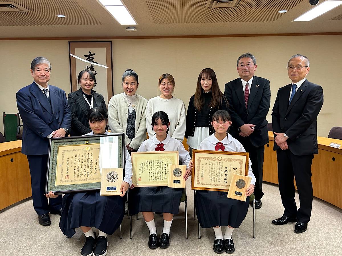 船橋市内の小・中学校5校の児童生徒が12月17日、11月に行われた音楽コンクールの全国大会で優秀な成績を収めたことを松戸徹市長と松本淳教育長に報告するため、船橋市役所(船橋市湊町2-10-25)を訪れた。