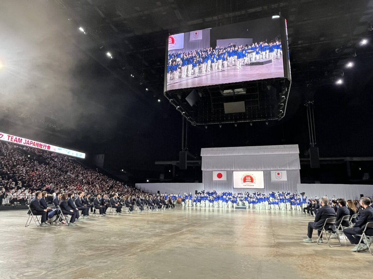 同日は先に日本選手団の結団式が行われ、秋篠宮さまご夫妻も臨席された。その後、壮行会が開催され、壮行会には日本選手団と役員69人のほか、日本オリンピック委員会会長・橋本聖子さん、応援リーダーとしてタレント・松岡修造さん、サブリーダーとして元卓球選手・石川佳純さんに加え、応援パフォーマンスには歌手・中島健人さんも登場。