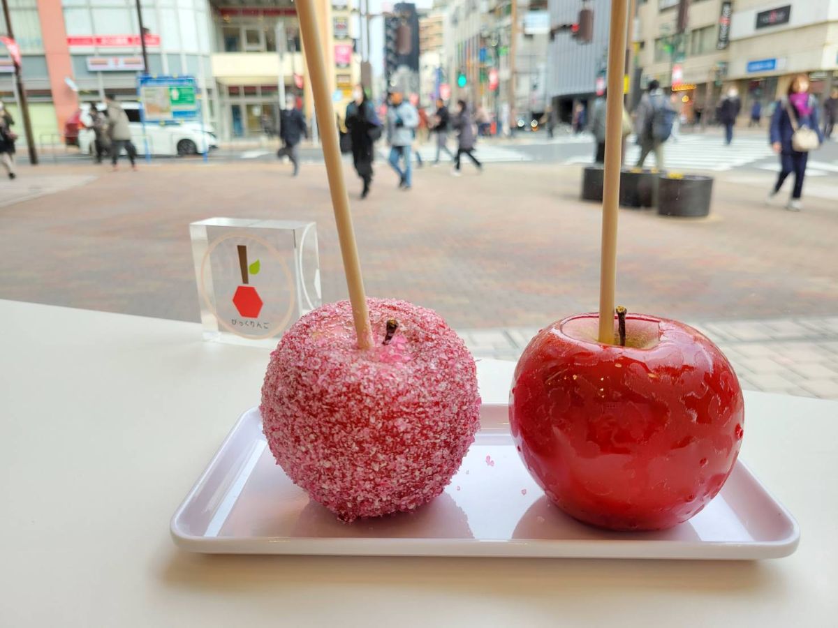 現在は、青森や信州産のリンゴを丸ごと1個使用したリンゴ飴「びっくりんご」(販売期間は2月末までの予定)と、さまざまな味が楽しめる「アイスは別腹」(1月30日まで)を販売。「びっくりんご」は薄くパリッと飴コーティングをした「プレーン」(680円)、いちごみるくキャンディーグリッターを使った「いちごみるく」(830円)など7種類を用意。食べやすい大きさに無料でカットすることも可能。パフェの「アイスは別腹」は「キャラメルバナナ」「ザクザクコーヒー」(以上650円)や「栗モンブラン」(680円)など16種類を用意する。1月31日からは苺のメニューが始まる予定だという。